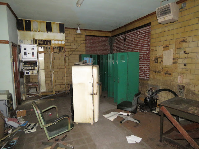 Other things that vanished include the defect detector readouts, all manner of random electronics and the 1930's vintage hanging overhead lamp. What stayed behind? The chairs and, the vintage Kelvinator refrigerator! It's also hard to tell if the PC green lockers were there in 1987 or brought in later to support a maintainers base. The wall behind the operator's with all the pasted up articles was obscured by a shelving unit with electronics on it, possibly in preparation for the re-signaling. In the Jan 13th video it also appears that the tower was a two person job, although there could be a number of reasons for an extra person to be on hand.