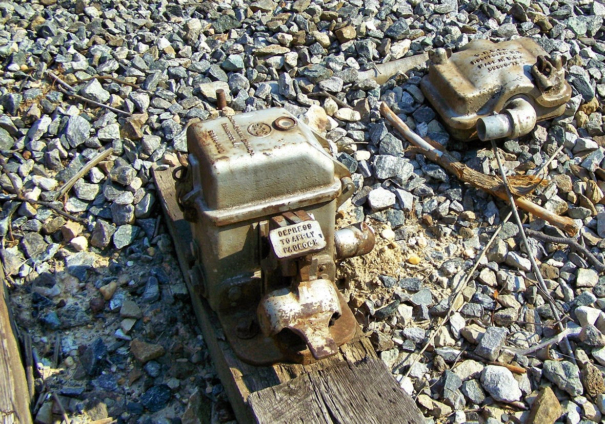The plunger style is a bit more recognizable due to its more prominent form factor. The plunger lock consists of a little housing, sometimes on a raised pedestal, mounted adjacent to any type of hand throw switch stand. The trainman opens the little door and requests a release by moving a crank type lever from the lock to unlock-request position, similar to a US&S table interlocking machine. This engages the relays and timers in the cabinet and when conditions are safe, a solenoid releases and the crank is able to complete its travel, raising a metal plunger that is physically blocking movement of the switch point rodding in the process. The plunger is either directly below the housing or below the hollow pedestal, if present.